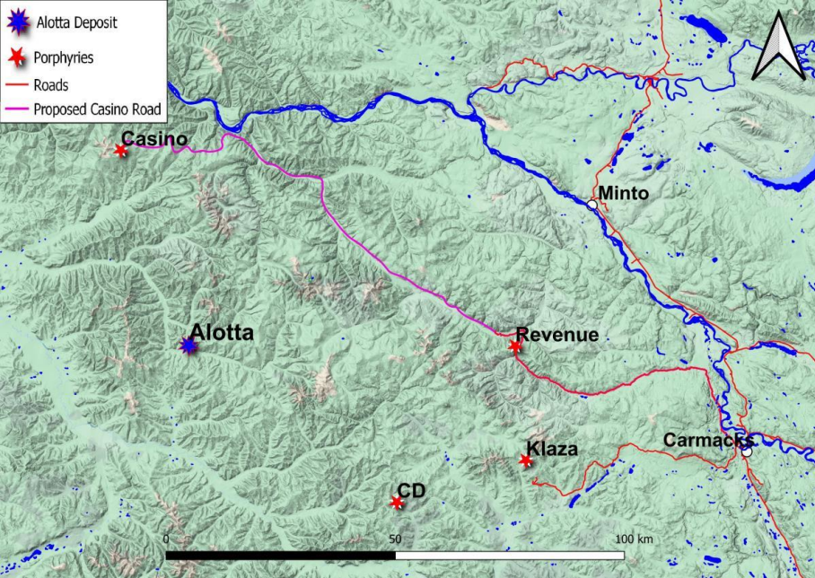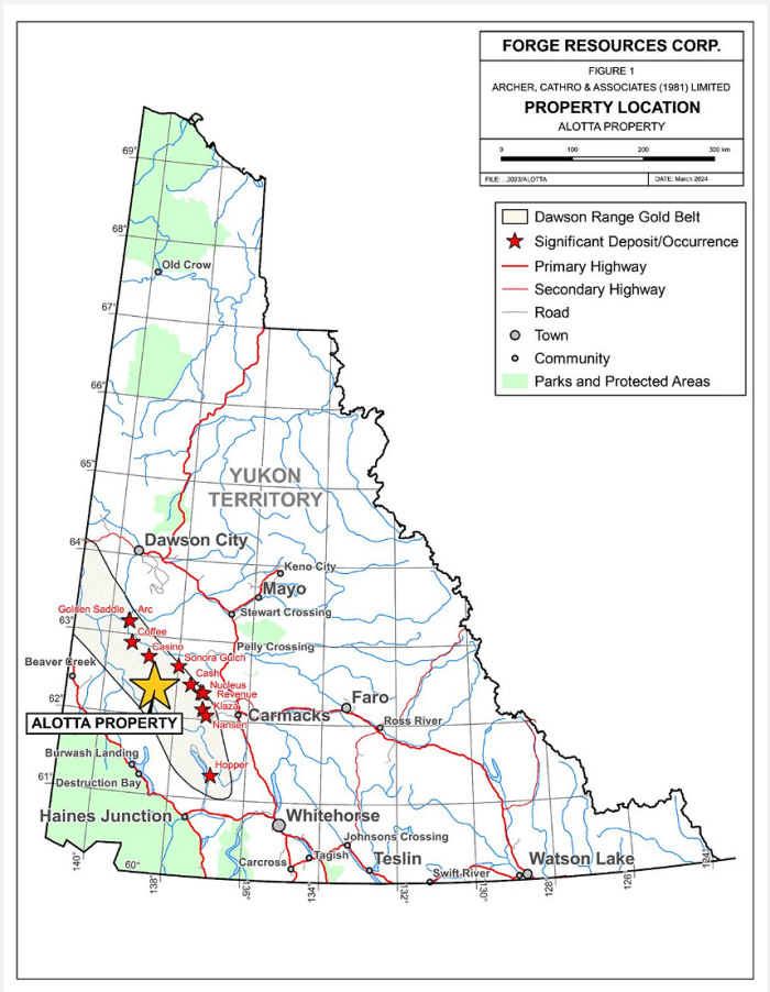 Forge Resources’ Alotta property sits in the same porphyry/epithermal belt (Dawson Range) that hosts the Casino deposit, a deposit that TSX: WRN has stated contains massive measured and indicated resources.