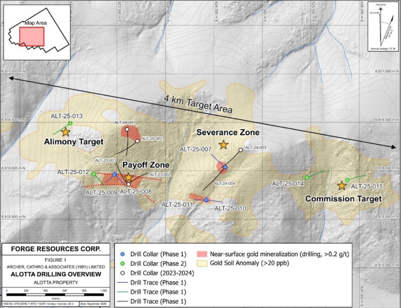 - The Alimony Zone lies approximately 800 m west of the Payoff Zone (575 m northwest of drill hole ALT-25-012, above). No drilling has been completed between these two zones.